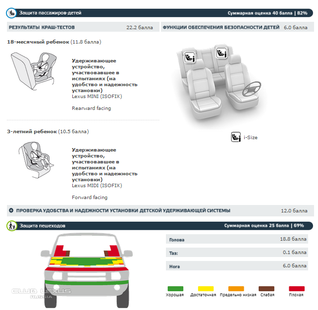 В «эн-иксе» инженеры не зря увеличивали долю высокопрочных сталей в кузове по сравнению с прообразом RAV4 (хотя общие у них только некоторые части пола). Если бы не удар о столб, при котором грудь манекена окрасилась в условный оранжевый (третий уровень защиты из пяти), всё было бы хорошо. Добавим, что в машине прекрасно выступила система автоторможения: при приближении к медленно движущемуся авто (20 км/ч) избежать столкновения Лексусу удавалось при своей начальной скорости вплоть до 70 км/ч. На высоких скоростях (до 80 км/ч) машина ударяла впередиидущую, которая резко тормозила. Но при этом Лексус хотя бы успевал снизить скорость удара до 22 км/ч.