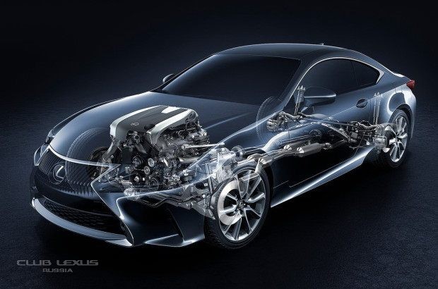 И заслуга управляемости RC вовсе не в том, что из IS сделали удачное, монолитное купе. На самом деле работа была проделана гораздо более серьезная. От седана IS конструкторы Lexus взяли заднюю часть, а вот среднюю (силовые короба, пороги, пол) использовали от IS в «кабриолетной» версии. Это и дало кузову купе отменную жесткость – ведь эта конструкция предназначена для эксплуатации даже без верхнего листа, крыши! На обратной чаше весов – масса этого «хребта». И вот тут уже вступает в борьбу третья составляющая конструкции Lexus RC : передняя часть с двигателем. А здесь – все от большого седана Lexus GS. И даже место для V8 в версии RC F!