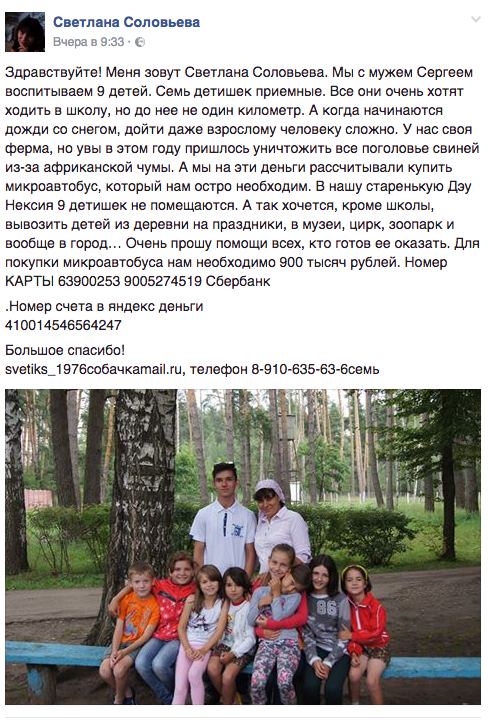 Нет, у Игоря, слава богу, всё хорошо. Но вот его знакомая семья из под Рязани, с 9 детишками, 7 из которых приёмные, находится в сложной ситуации. И всё бы ничего, люди трудолюбивые, справляются. Но год для них сложный. Впрочем, что я рассказываю. Я лучше опубликую здесь пост Игоря из facebook. Ну и Светланы - тоже. Там всё будет понятно.