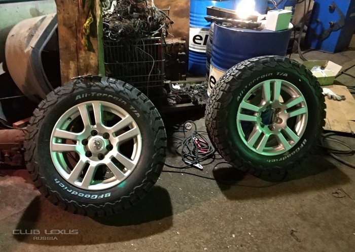 Авто на дисках от TOYOTA PRADO 150 с отличной новой резиной BF GoodRich AT. Резина абсолютно бесшумная и не бьющая, но при этом очень проходимая и смотрится брутально. Но если она кого-то смущает, то вы легко сможете её продать за весьма хорошие деньги и на них купить любую другую резину.