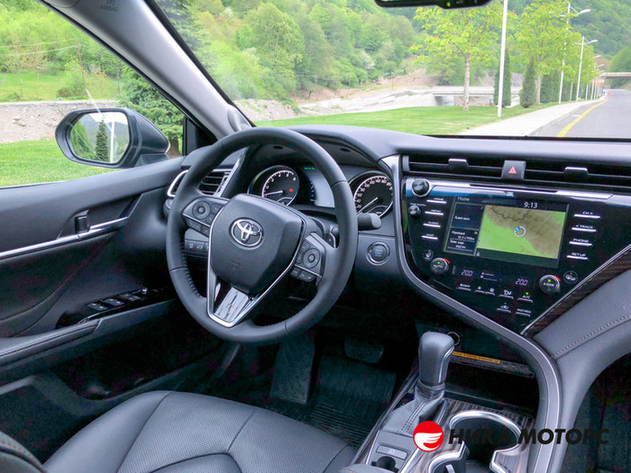 В движении новая Камри поначалу удивляет своим активным участием в движении и периодическим желания о чем-то предупредить. Это и система считывания дорожных знаков, которая сообщает о превышении скорости и система контроля за полосой, которая следит теперь не только за разметкой, но и контролирует обочину - отличает асфальт от гравия. Основная информация транслируется на проекционный дисплей, который тут 10-дюймовый и, как заявляет производитель, самый большой в классе.