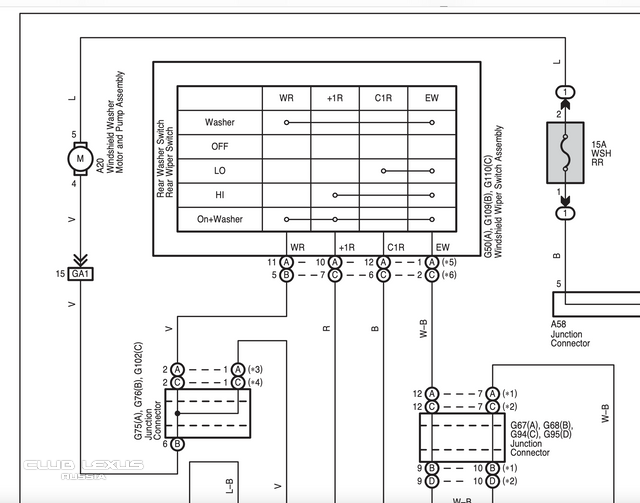 Поскольку при включении омывателя задний дворник включается, делаю вывод что переключатель исправен и дело в проводке между разъемом G75 и G76 и насосом.