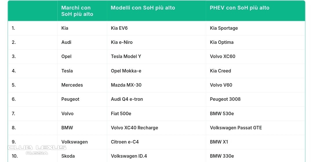 Из 1366 проанализированных автомобилей (723 полностью электрических и 643 подключаемых гибридов) восемь из десяти сохранили не менее 90% своей первоначальной ёмкости . В частности, Kia EV6 продемонстрировал наименьшее снижение мощности среди всех протестированных моделей, сохраняя ёмкость выше средней с течением времени, даже после многих лет эксплуатации и большого пробега.