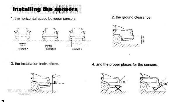 Дырки сверлятся на самых крайних (внешних точках бампера, так чтобы в угол обзора датчика (90град.) не попадали части бампера и пр. и не перекрывали ему обзор (там еще картинка - проверка по отвесу).