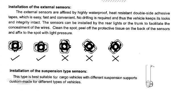 Схема размещения датчиков прилагается. Датчики имеют определенный угол обзора. Я купил в Гонконге. Комплект с 4-мя датчиками и дисплеем обошелся в $60. Только я забыл сказать, что мне нужен дисплей метрический. По умолчанию, выслали в футах.
