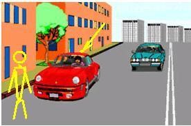 Стрелкой указана моя машина, из-за которой пешеход не видит сзади меня идущую машину, а водитель зеленой машины не видит пешехода.