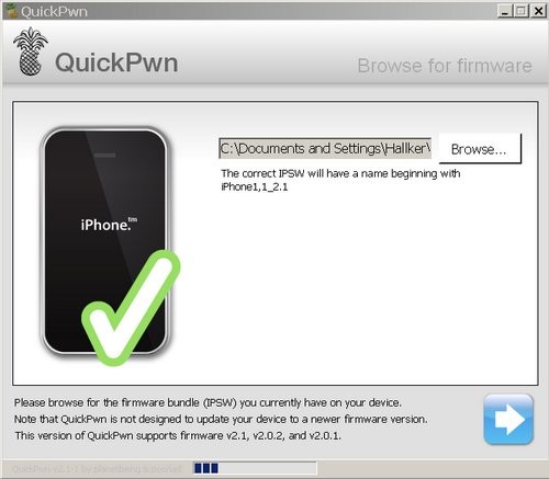 4. Запускаем "пивнягу". она сама найдет аппарат- выбираем в окошке недавно скаченную и установленную прошивку 2.1 и жмем стрелко