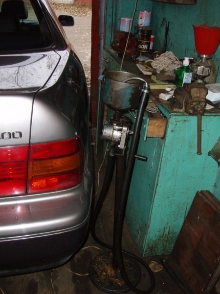 Я использовал самодельное приспособление, которым поделились соседи из автосервиса, оно на фото ниже. Оно состоит из емкости для масла, ручного насоса и шланга - очень удобно и быстро.