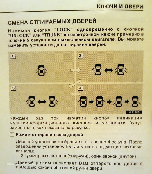 Нажимая на кнопку LOCK одновременно с кнопкой UNLOCK или TRUNK на электронном ключе примерно в течение 5 секунд при выключенном двигателе.