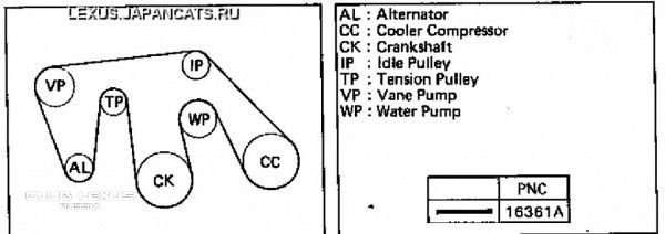 у меня конддишн клинанул. то же самое было. порвал ремень... снял кондей, ща думаю че с его муфтой делать.. а пока поставил укороченный ремень. Помпа крутится ремнем ГРМ. Поликлиновый (это вот как раз этот) приводной ремень крутит Генератор, Гур, Термомуфту вентилятора и Кондиционер. и еще проходит через 2 ролика: натяжной и обычный. То что на рисунке обозначено WP - water Pump - это как раз термомуфта вентилятора.