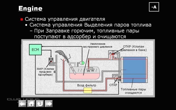 Когда Вы заправляетесь, топливо в бак поступает достаточно быстро, сто приводит к повышению давления внутри бака.Пары бензина начинают выходить через адсорбер и фильтр.При исправности (Или корректной работе) клапанов адсорбера и чистом воздушном фильтре скорость выхода паров топлива по пути обозначенному красной стрелкой соответствует скорости поступления бензина в бак и счастливый владелец авто не ощущает геморроя с заправкой.