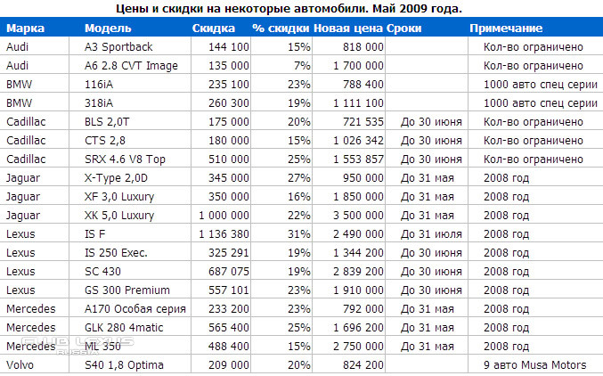 BMW 1-Series Jaguar XK Mercedes-Benz A-Class Infiniti EXПадение продаж новых автомобилей в России за четыре месяца 2009 года достигло 44% относительно того же периода благополучного 2008 года. Сегодня каждый клиент и каждая успешная сделка для дилера праздник. И чтобы устраивать себе такие праздники почаще, дилеры придумывают акции, подарки, строят умные финансовые схемы или прямолинейно, но наиболее действенно объявляют о скидках. Если есть возможность – надо пользоваться: кризис пройдет, и купить автомобиль со скидкой 1 000 000 рублей станет затруднительно.....................
