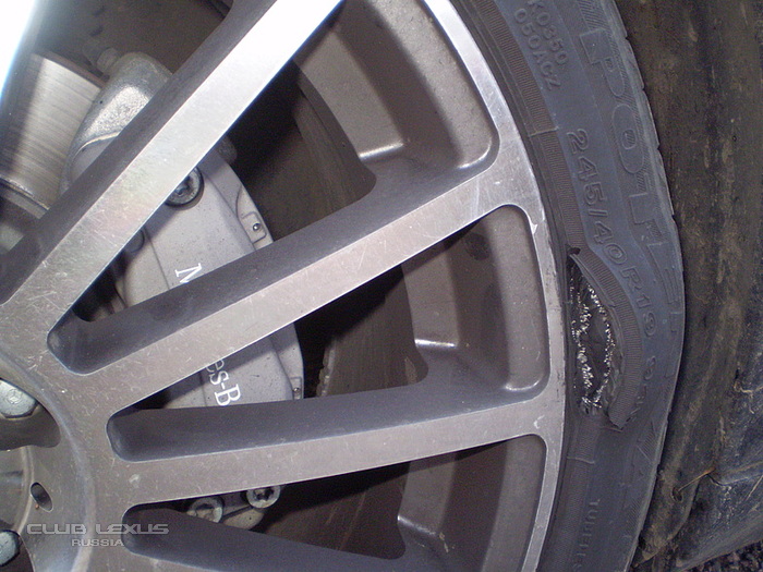 Бриджстоун Потенза RE050A 245/45 R19. Это результат накачки до 2,5 - на слабонакаченном колесе влетел в ямку. Попадал в более жёсткие ямы с давлением 3 и ничего, а тут решил подспустить колёса комфорта ради.. вот и результат.. кстати, пропоров так и ничего не понял - чуть стало вроде руль тянуть и всё.. летел на колесе со скоростью 110-120км/ч.. проехал км 40-50.. ужаснулся, как приехал и увидел..