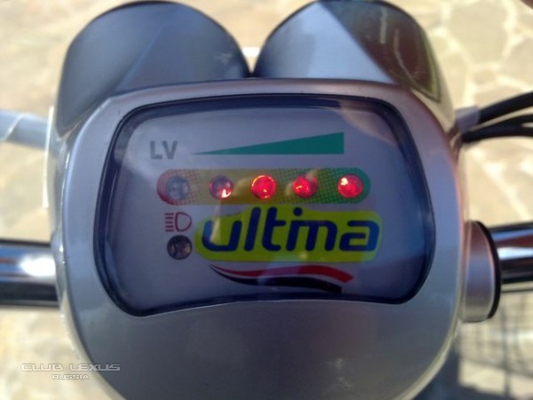 Короче, к ночи ближе загнал велик в гараж и поставил на зарядку. Зарядное устройство - отдельная теме. Огромное, но легкое. Три разноцветных светодиода подписаны китайскими иероглифами. При включении в сеть загораются ... все три. Ну ничего. Поставил на ночь "заряжаться" (?). Забрал домой "приборный щиток", куда с тоски приклеил кусочек от случайно завалявшейся наклейки BP Ulitmate (оставив только "ultima") на место малоприличных китайских надписей (не берусь воспроизводить, но вызывает смех у всех читающих).