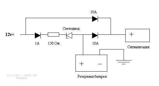 10А диоды ограничивают потребляемый ток, а 1А диод ограничивает зарядный. Резистор для ограничения тока. Светодиод устанавливается наоборот (навстречу диоду), служит для ограничения напряжения. Альтернативно светодиоду можно поставить 3 1А диода последовательно.