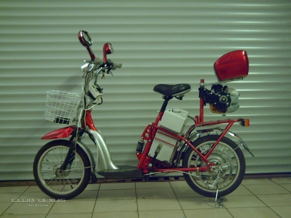 А еще нашел один 100%-ый гибрид с ДВС, т.е. с бензомотором (25 кубиков) + электро + педали. Видок только смущает ...