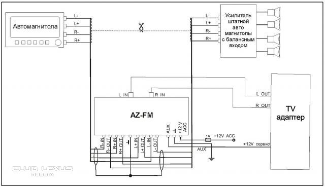 провода между усилителем и радио (головой) необходимо резать согласно схеме: