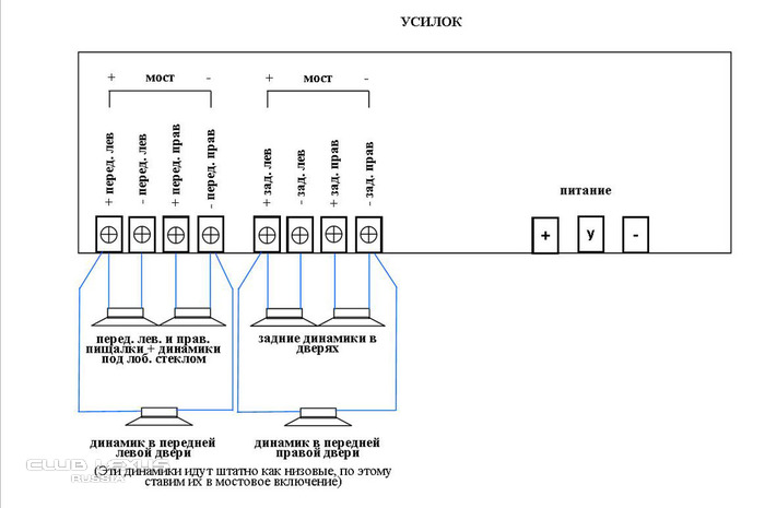Ну судя по твоей схемке,рулиться у тебя будет неправильно!!!Если ты захочешь сделать баланс между зад.лев и зад пр.,то у тебя всё это скажется на передний пр.дин в двери.Т.Е.я хотел сказать что каждый динамик должен быть нагружен на свой УС. А по поводу кол-во приборов в цепь,это смотря каких приборов и какого качества) А так всегда надо полагаться на свои уши!!Нравится как звучит и пусть звучит.Если по твоему мнению стало лучше,значит результат достигнут и он положительный!!