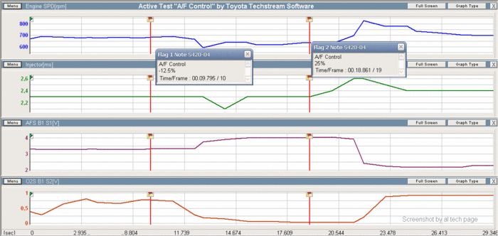 2. В разделе Active Test есть два теста "O2 Contol..." и "AF Sensor Conrol...". Пишу не точно, так как ноутбука под рукой нет, но смысл будет понятен. В перечень параметров включите все по кислородникам и коррекции. Сначала приведите систему в 0% затем в -12.5% затем в +25%. Выдерживайте паузу около 15-20 сек.