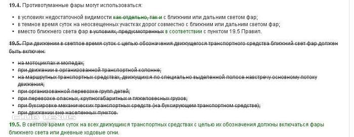 19.5. В светлое время суток на всех движущихся транспортных средствах с целью их обозначения должны включаться фары ближнего света или дневные ходовые огни."