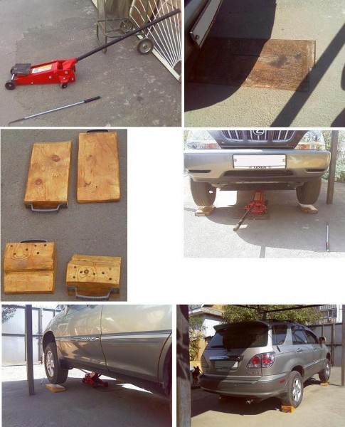 - сам домкрат оказался коротковат, поэтому когда засовываешь его под перед машины, у рычага накачки остается слишком малым ход, мешает защита картера (висит слишком низко.