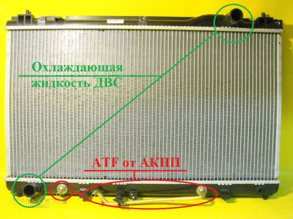 На подавляющем большинстве автомобилей оснащенных АКПП сюда же входит и ЕС300/330 радиатор охлаждения АТФ расположен внутри нижнего бачка радиатора двигателя, обмен теплом происходит между АТФ и охлаждающей жидкостью двигателя.