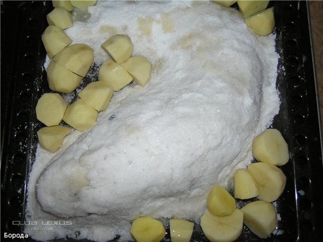 Так рыба берет только свое... если шкурку не снимать, а брюхо зашить... Very Happy Соль превращается в панцырь, который приходится потом разбивать молотком... Забыл добавить, что когда из рыбы делаем куличик, то смачиваем соль взбитым яйцом и водой...