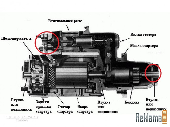 Как бывший автоэлектрик могу сказать, что когда пригорают пятаки на втягивающем реле запуск двигателя будет происходить не постоянно а скажем с определённой периодичностью, т.к сам пятак, который замыкает контакты (это постоянный +, и силовая шина на сам стартер) вращается на оси и может замыкать в тех местах которые сработались, т.е выгорели больше. Раньше на автомобилях втягивающее реле разбиралось и можно было поменять сами контакты и пятак. Сейчас по моему оно наглухо завальцовано. Второй вариант перекос в передней втулке самого стартера (см. рисунок) сам недавно с этим столкнулся на другой машине.