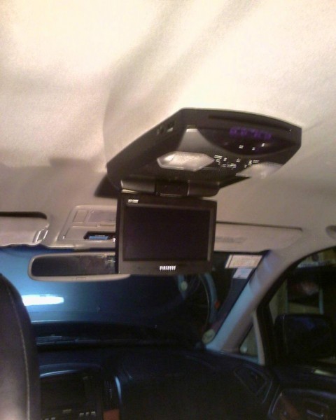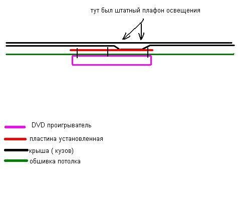 Вытаскивается салонный фонарь. Он крепится к каркасу крыши четырмя болтами. На штатные отверстия крепятся штатными же болтами две дюралевые пластины, которые засовываются под обшивку через окно, оставшееся от салонного светильника. В итоге получаем ПОД ОБШИВКОЙ каркас, к которому крепится сам потолочный DVD.