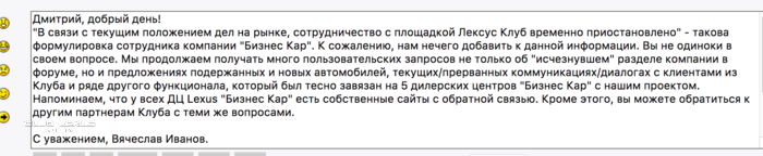 Практически сразу же пришёл мне написал заместитель начальника отдела клиентских отношений из Лексус-Рублёвский. Девушка попросила меня написать ей ФИО предыдущего владельца и ВИН.
