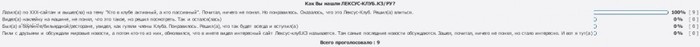 | Пили с друзьями и обсуждали мировые новости, а потом кто-то из них, обмолвился, что в инете видел интересный сайт Лексус-клуб.КЗ называется. Там самые последние новости обсуждаются. Зашел, почитал, ничего не понял, но стало интересно. И вот я тут(а) | 5% | [ 1 ] |