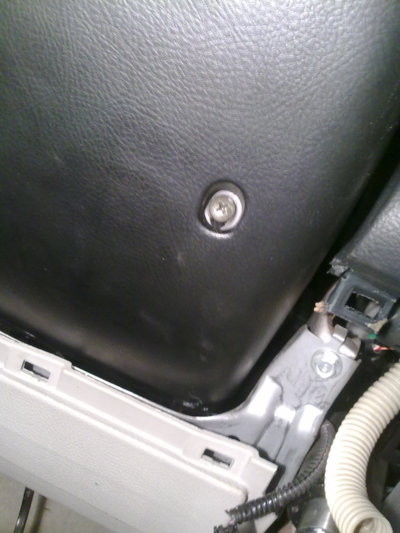 3) снимаем нижнюю часть (под рулем) передней панели: она на клипсах, одном болте (левый нижний угол) и одном шурупе (под заглушкой в правом нижнем углу);