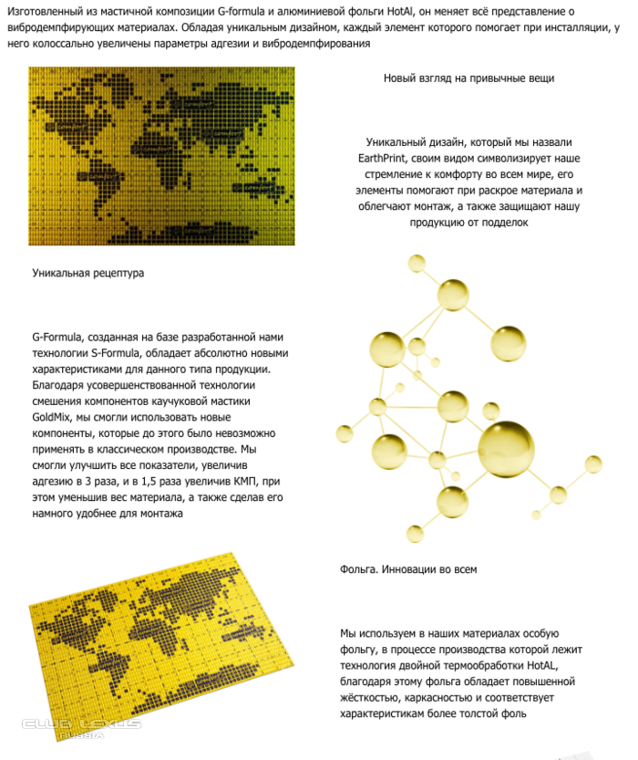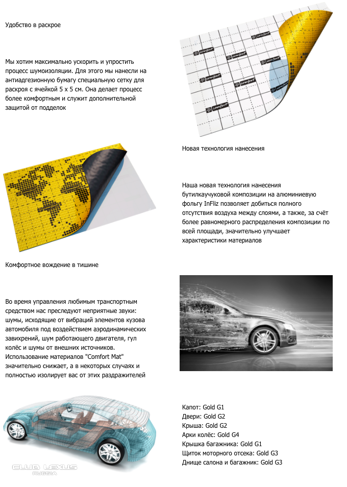Как я потом исследовал - сперва мне положили слой виброизоляции. Некой comfort mat gold, в моём случае комбинации листов G2 и G3. Никто ничего мне не рассказывал про материал (да я и не спрашивал), но ради интереса почитал про него в интернете. Пишут гладко, складно, впрочем как еще в рекламе? Ну вот как-то так: