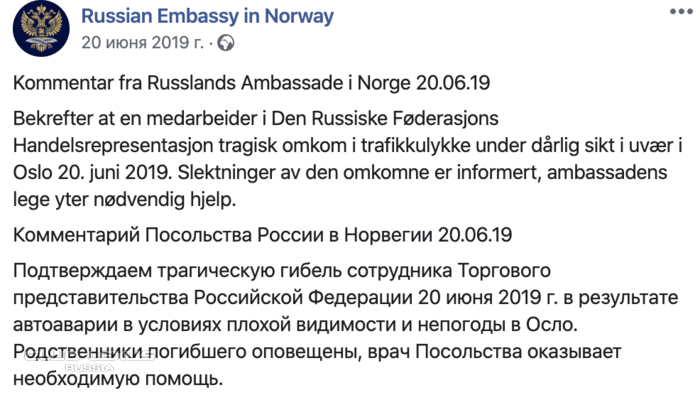 Смертельный инцидент произошел в ночь на 20 июня. Погибшим оказался сотрудник торгового представительства России в Норвегии. Российское посольство подтвердило эту информацию и сообщило, что авария произошла из-за плохой видимости и непогоды.