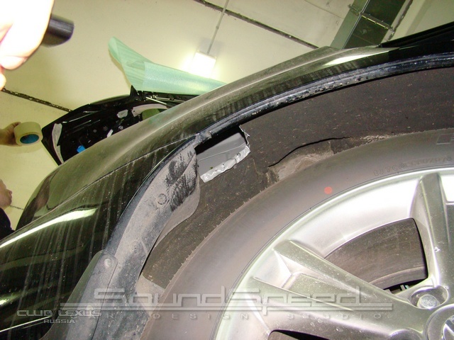 Штатная сигнализация (сирена), в этом автомобиле находится в нише заднего правого крыла. "Ребята", зная этот факт, сделали в колесной арке "технологическое отверстие", через которое, легко сняли разъем проводов с сирены...