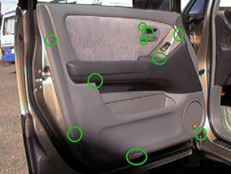 2. При помощи крестовой отвертки, откручиваете два винта снизу обшивки, один винт под ручкой/подлокотником, один под заглушкой за ручкой открывания двери,