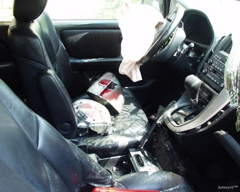 Знакомый в нетрезвом состоянии примерно на скорости 140км/ч или больше не вписался в левый поворот, ушел прямо. Перескочив через бордюр, и врезался в бетонную опору рекламного щита (3х6м). Водитель и пассажир на переднем справа, живы, с небольшими травмами были доставлены в больницу. Видимо спасло, что оба были в хлам пьяные. После удара наблюдалось небольшое задымление, люди проезжающие мимо, помогли. Из 20ти машин, работало всего 2 огнетушителя.