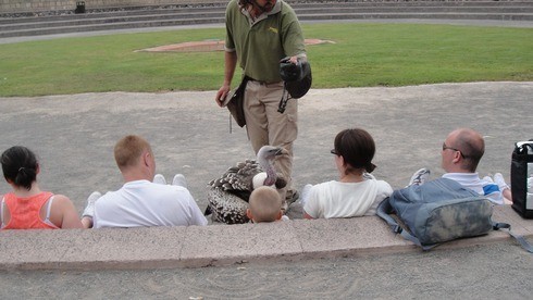 Орлы все летают высоко и далеко. Их даже иногда не видно. Некоторые возвращаются уже после представления. Народ уже весь разошелся, а тренер в красной панаме бегает по арене зазывает птицу обратно. Не понятно как вот эти тимоны не боятся их. А может и боятся – все время вверх смотрят.
