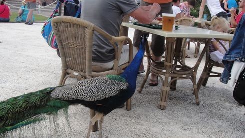 Пока дети лазают и катаются родители могут отдохнуть в кафешке и погонять павлина попрошайк. Попить пива Mahou (пиво так себе, но лучшее что там есть и зато литр))). Дети помогут допить.)))