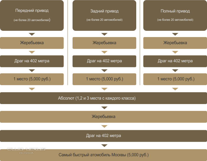 Внутри класса автомобили не делятся, а соперники выбираются только жеребьевкой, которая проходит перед началом мероприятия.