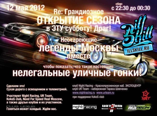 Открытие сезона (по версии клубов NightRacing, URTeam, при поддержке Kokos Club, NFSRM & iLLSkill), перенесенное с 5 мая из-за погоды, пройдет 12 мая! Трасса сухая в любых вариантах!