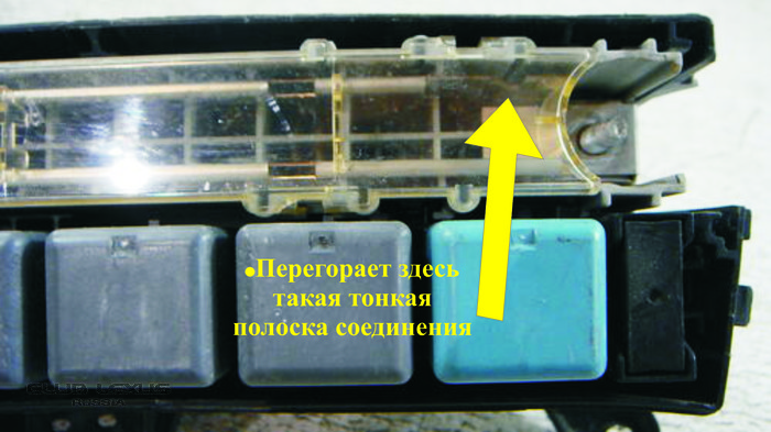 Там сгорает силовой предохранитель. Это такая длинная пластина похожая на жестяную или аллюминиевую, она расположена под прозрачным пластиком. перегорает в месте подключения к проводу (справа сверху, со стороны салона то есть).
