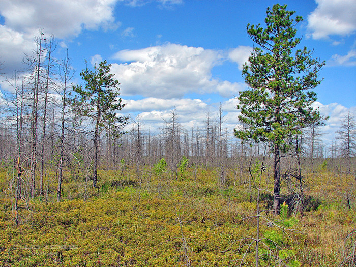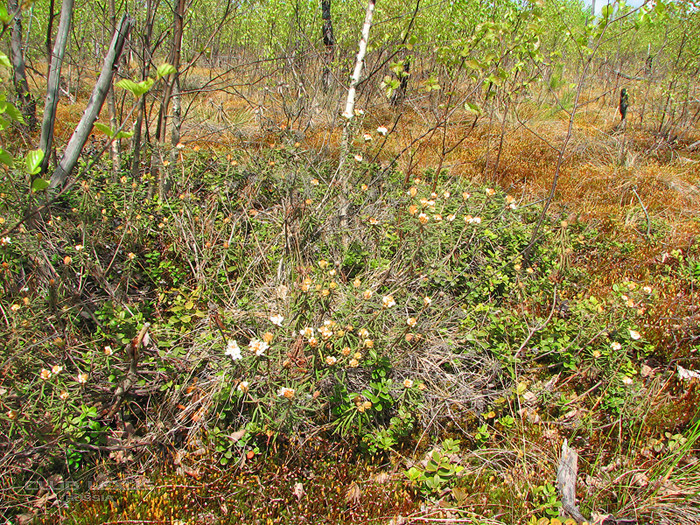 Карликовый лес. Берёзки, сосёнки. Вместо травы цветущий багульник.