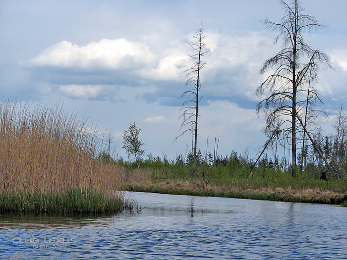 Река Созь сильно петляет в болотистых берегах. По берегу пройти почти не возможно. Еловый сухостой словно забор-частокол не пропускает.