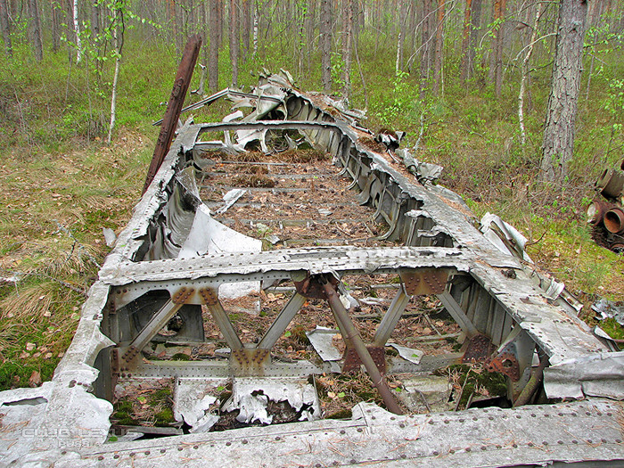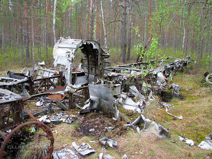 Спрятав лодку на берегу, идём по GPS-навигатору к самолёту. Он лежит примерно в семистах метров от берега. Вот его остатки. Охотники за цветметом обглодали его до самого скелета-каркаса.