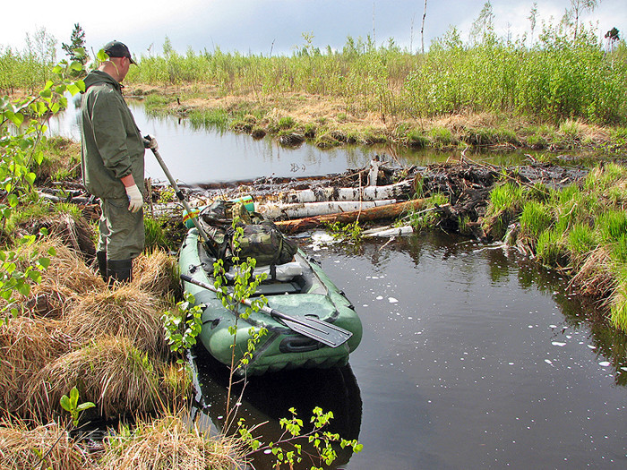 Когда-то давно этот канал прокопали торфоразработчики. На его протяжении попадается несколько запруд. Перепад уровня воды до и после плотины реально заметен. Мы делаем вывод, что уровень воды в Светлом на 1,5 метра выше чем в Щучьем.