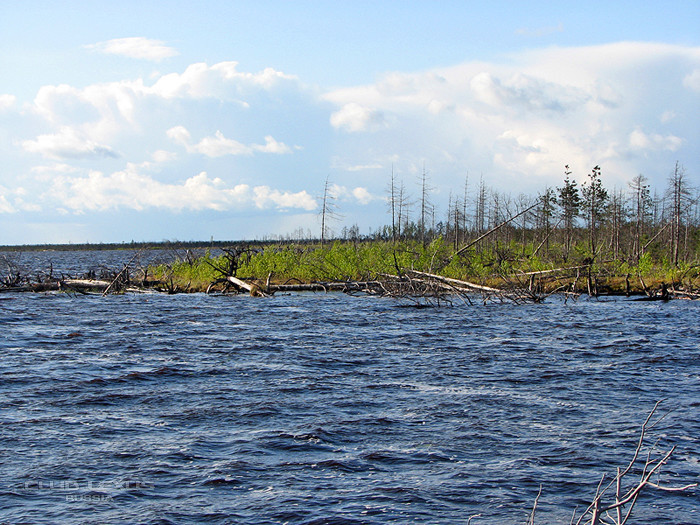 Далее переправляемся через озеро. Нам нужно найти протоку ведущую к Щучьему. И, честно говоря это не так то просто. Диаметр Светлого более 3-х километров. Другой берег на горизонте. Засекаем направление по компасу и плывём. Сразу попасть в протоку не получается. К тому же мешает сильный порывистый ветер поднимающий большие волны на озере. А полную радость добавляет ещё и дождь со снегом!