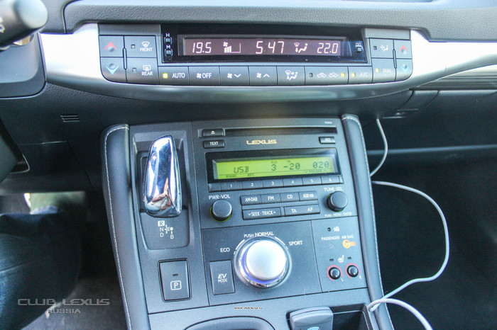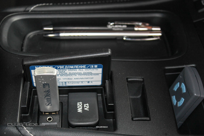 Оба автомобиля имели идентичную крышечку между передними сиденьями, под которой прячется гнездо «прикуривателя» (в кавычках, потому, что пепельницы в CT 200h не предусмотрено и правильнее было бы называть не «прикуриватель, а «разъем 12 вольт»), а также два входа – AUX и USB. Последний вход без проблем понимает как iphone и начинает проигрывать имеющиеся в нём треки, так и обычную флешку с MP3-содержимым.