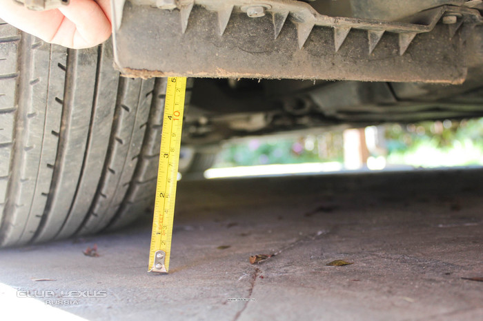 В случае c CT 200h главным слабым звеном оказались грязезащитные щитки передних арок. Измеряем расстояние от их нижней точки до земли - немногим более 12 см. В группе риска так же пластиковая защита картера, он буквально несколькими миллиметрами выше щитков. Именно эти детали придётся в скором времени менять, если злоупотреблять скоростным преодолением плохих дорог. Хотя, несомненно, первый "земляной парктроник" это бампер, он первым отзовётся на непреодолимое препятствие жалобным скрежетом.