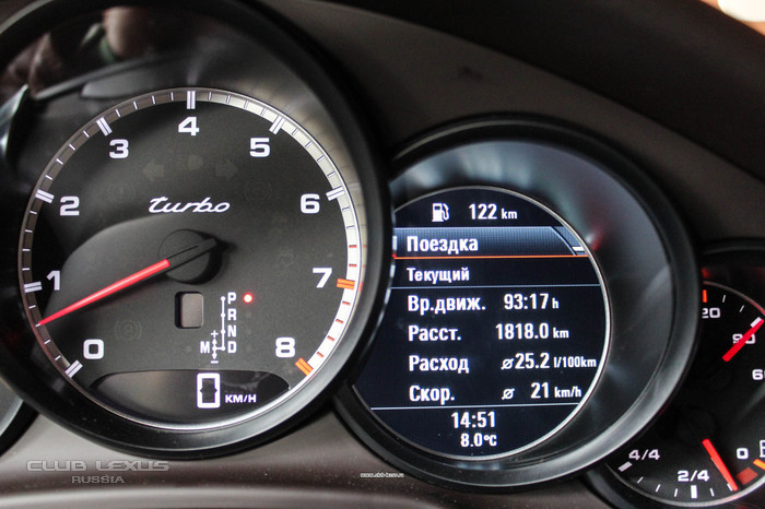 Разгон на Panamera - как аттракцион. Сначала захватывает дух и приводит в восторг. Потом привыкаешь и всё равно нравится, хочется. А потом наступает насыщение и умиротворение. Так я и ехал в итоге по трассе. На щитке приборов светилась цифра "7", обозначающая седьмую передачу, а тахометр замер на метке чуть более 1000 при 110 км/ч ... А что же здесь с расходом топлива?!